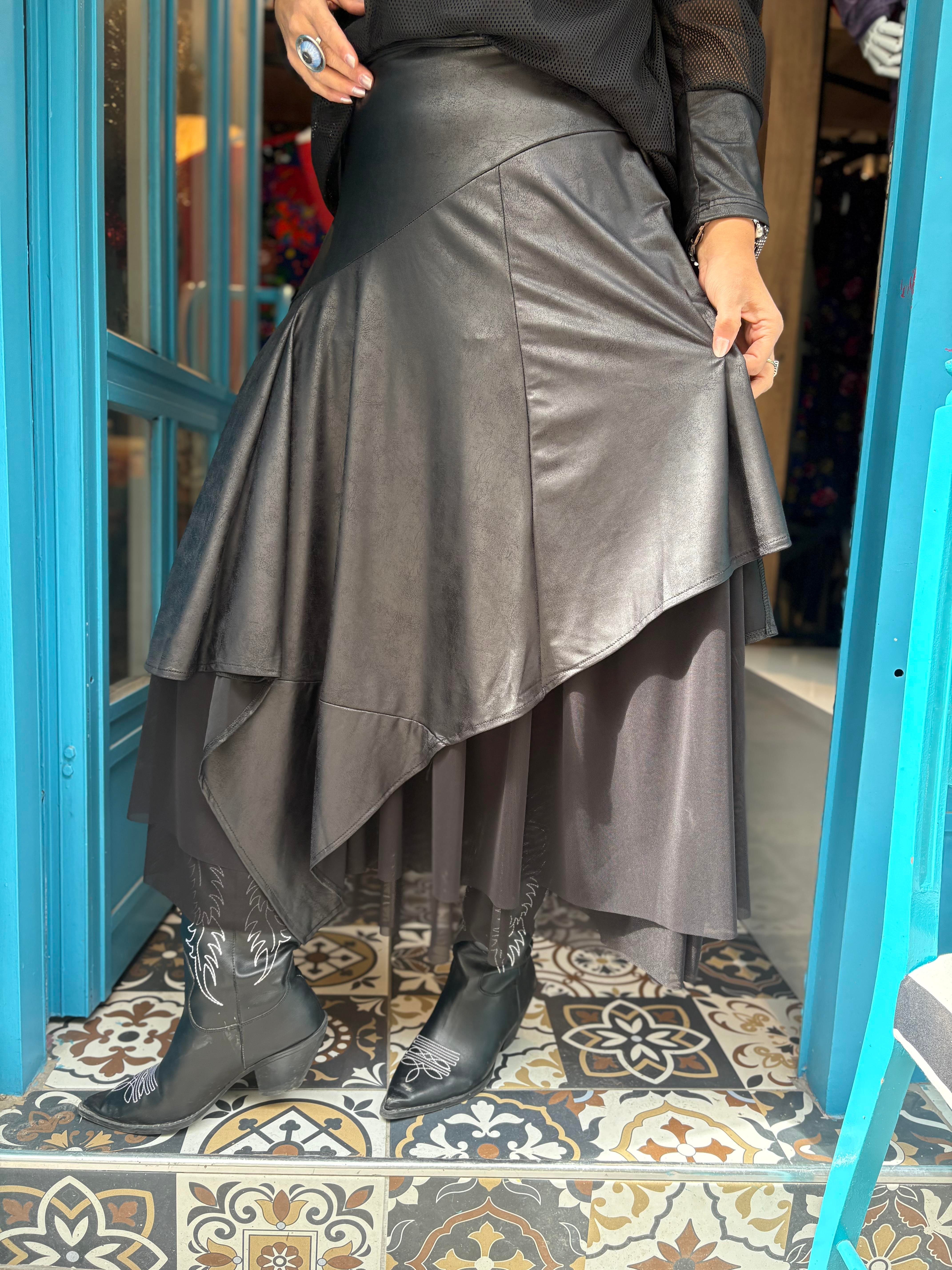 Tül Detaylı Deri Etek
